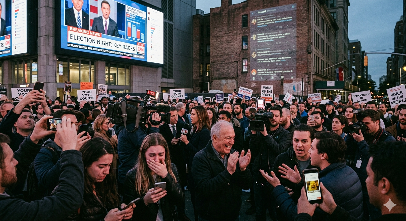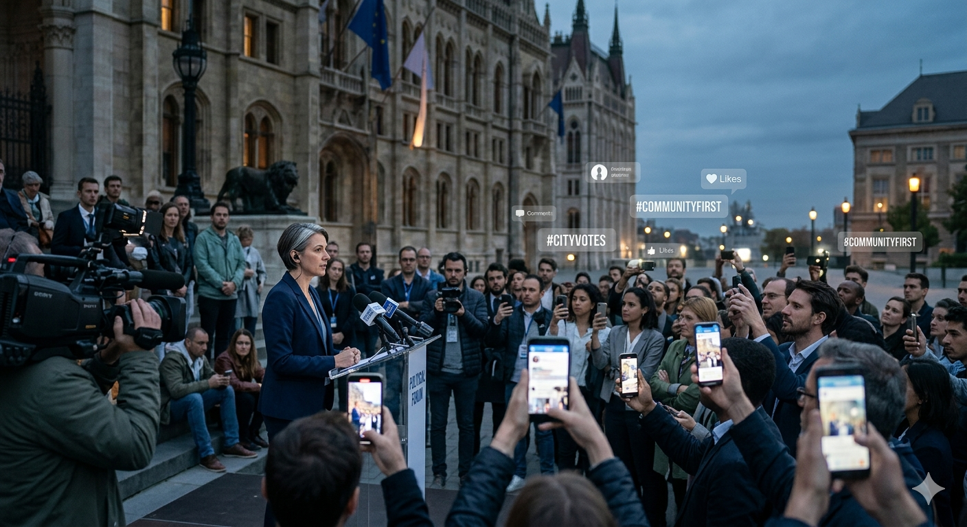 Hvordan sociale medier, hurtig informationsspredning og nye kommunikationsformer ændrer måden politiske beslutninger skabes og forstås på A modern political communication scene showing a mix of